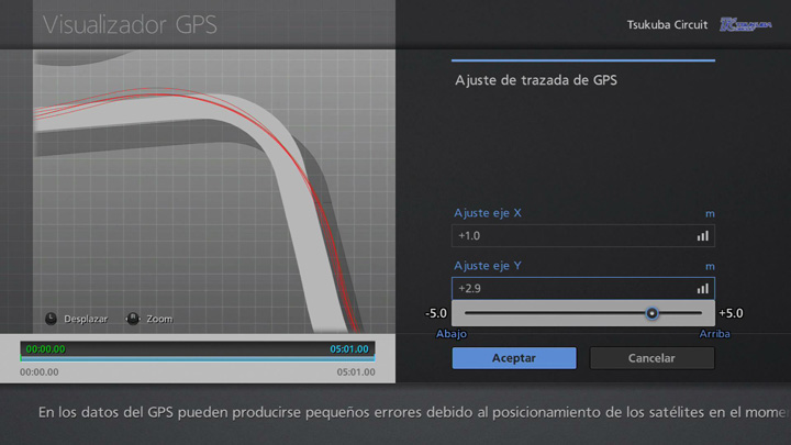 Los ajustes deben realizarse para que la trazada que se muestra en el mapa del circuito de la izquierda coincida de forma más precisa con la trazada real. Selecciona "Ajuste eje X" y se mostrará un indicador que te permitirá mover la trazada a la izquierda o a la derecha. Del mismo modo, el indicador que aparecerá al seleccionar "Ajuste eje Y" te permitirá moverla arriba o abajo. Usa los joysticks izquierdo y derecho para desplazarte por el mapa y controlar el acercamiento o alejamiento de la cámara, de forma que te resulte más fácil realizar los ajustes.