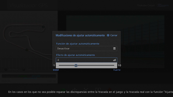Si no has conseguido resolver las discrepancias entre la trazada del juego y la real empleando la opción "Ajustar trazada de GPS" para mover la línea arriba, abajo, a izquierda o a derecha, intenta activar la Función de ajustar automáticamente. Esto hará que las ruedas del coche sigan la superficie del circuito, corrigiendo aún más los posibles problemas.