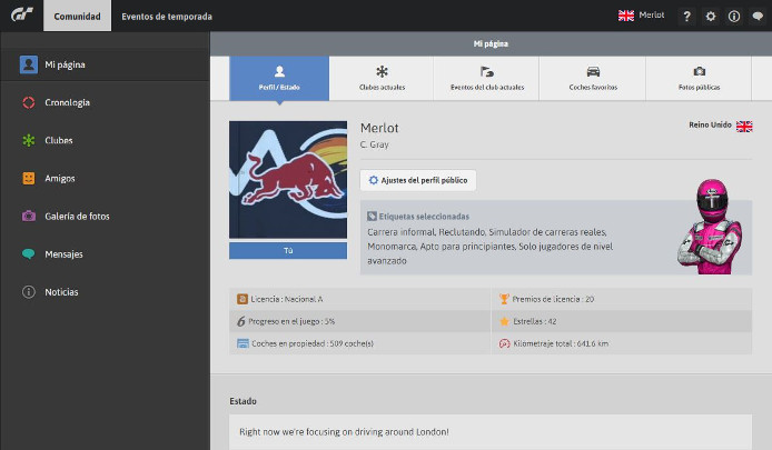 Las funciones de la comunidad de gran-turismo.com son las mismas que las de Gran Turismo 6, con las siguientes excepciones. Las opciones "Mi página", "Cronología", "Mensajes", "Noticias", "Clubes", "Amigos" y "Galería de fotos" están disponibles en la parte izquierda de la pantalla. Haz clic en los botones para cambiar de una a otra. Consulta la sección "Comunidad" de este manual para obtener más detalles sobre estas funciones.