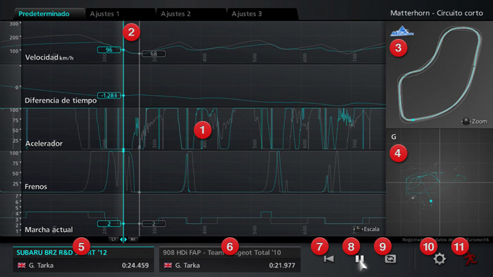 Para reproducir o pausar los datos del registrador cargados de una repetición, pulsa "Reproducir/Pausa" (8). Mientras se están reproduciendo los datos del registrador, la línea vertical conocida como cabezal de reproducción se moverá por la zona del gráfico, permitiéndote observar los cambios en los datos de conducción. La posición del coche se muestra en el mapa del circuito (3), mientras que el medidor de fuerza G (4) muestra los niveles cambiantes que se producen de aceleración gravitacional ("fuerza G"). Puedes rebobinar o avanzar rápidamente los datos del registrador con los botones R1 y L1. Los botones R2 y L2 te permiten moverte entre las secciones de los datos del registrador. Podrás ajustar la escala de los gráficos con los joysticks izquierdo y derecho.