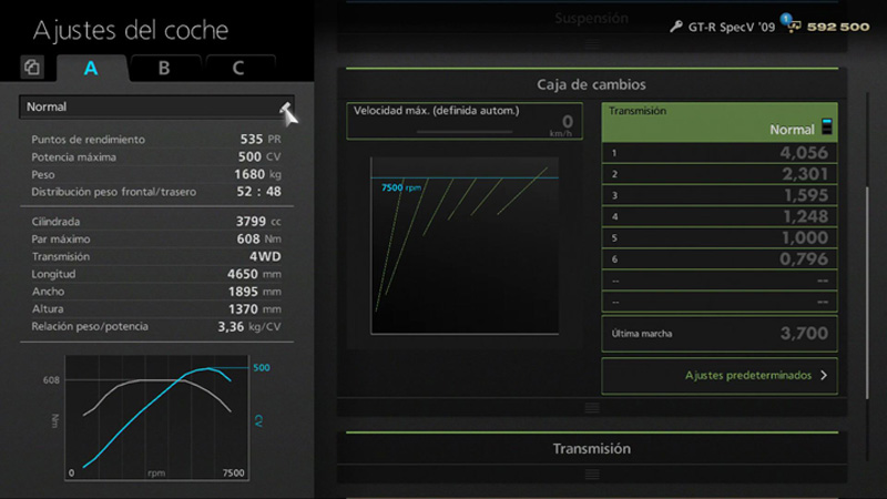 - Los diversos ajustes que se pueden configurar se muestran en el siguiente orden: neumáticos, suspensión, caja de cambios, transmisión, potencia y carrocería.