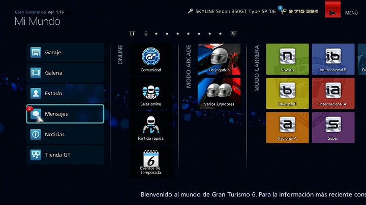 Para usar la función de mensajería, inicia sesión en PSN℠ antes de iniciar Gran Turismo 6. Para obtener más detalles sobre la mensajería, consulta la página "Mensajes" en la sección "Comunidad" de este manual.