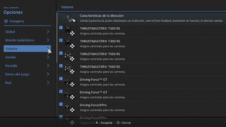 Los volantes indicados en la lista que hay a continuación se pueden utilizar para conducir tu coche durante las carreras. Si usas dos volantes, puedes asignarlos como mandos 1 y 2 y cambiar sus ajustes por separado.