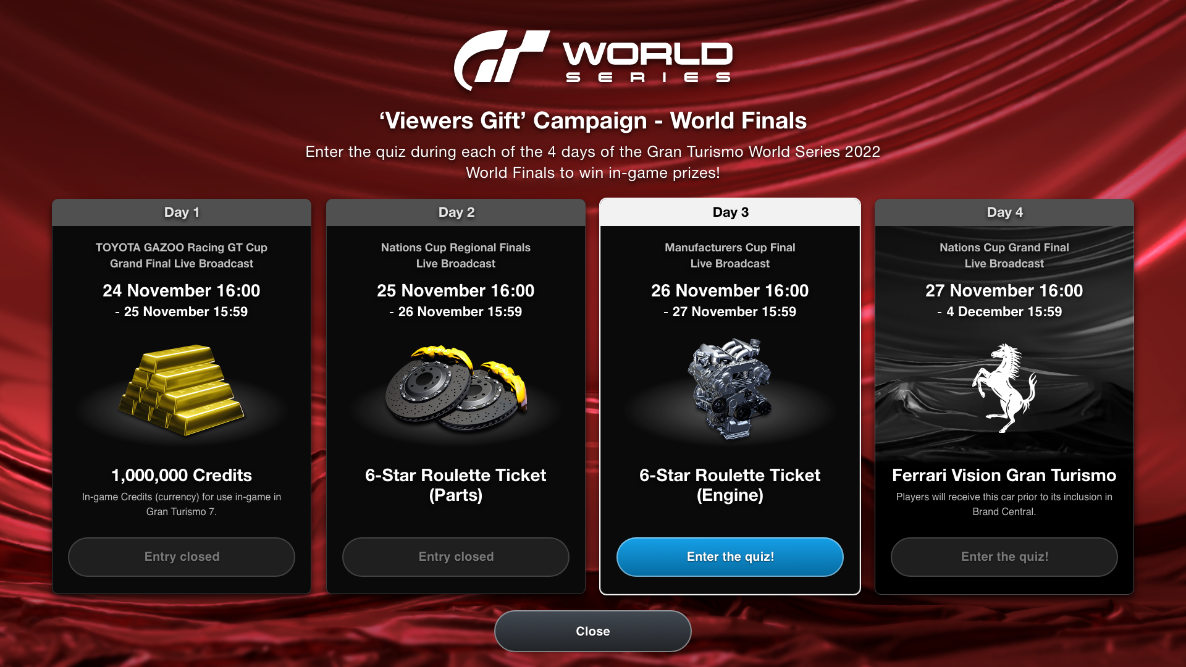 Llevaremos a cabo una campaña de regalos de cuatro días junto con la Final mundial de la Gran Turismo World Series 2022 en Mónaco, del 24 al 27 de noviembre. Al responder correctamente a las preguntas relacionadas con las retransmisiones de la Final mundial, los jugadores podrán recibir objetos del juego, ¡así como un acceso anticipado al "Ferrari Vision Gran Turismo"!