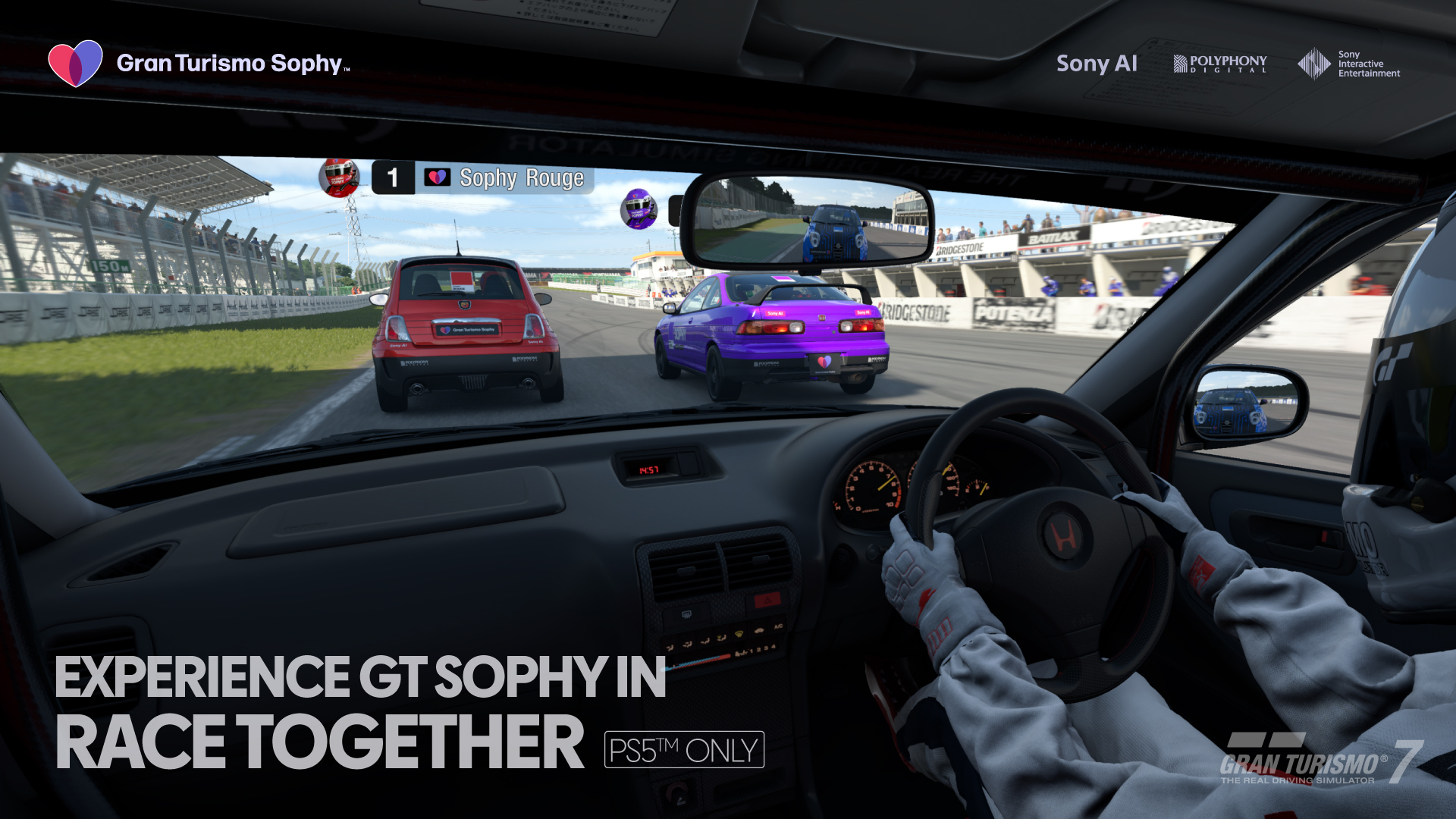 En el evento "Race Together", jugadores de cualquier nivel de habilidad podrán desafiar a GT Sophy en una serie de cuatro carreras con una dificultad que se irá incrementando, desde Principiante a Intermedio y Experto. Los jugadores también podrán retar a GT Sophy en un uno contra uno, en el que competirán contra GT Sophy cara a cara a lo largo de cuatro carreras y con una configuración del coche y unos ajustes idénticos.