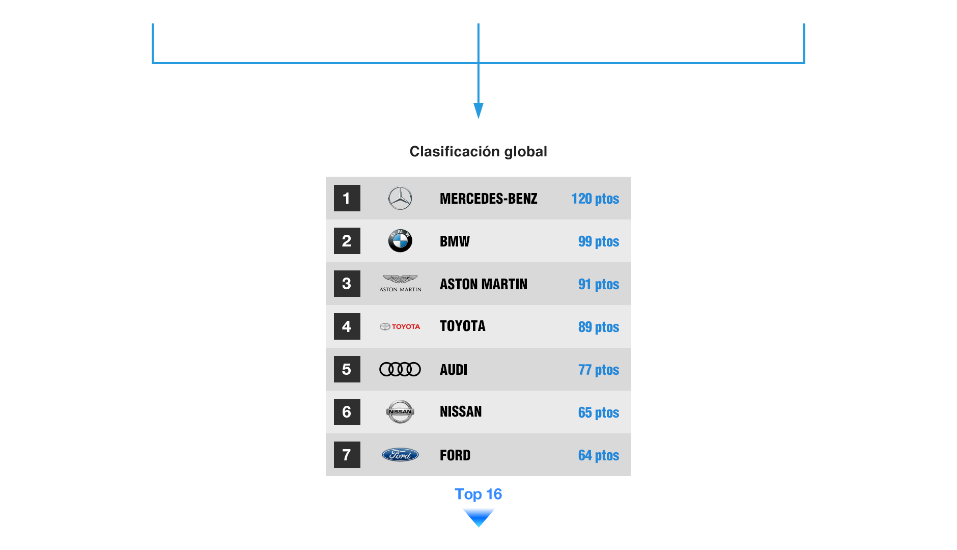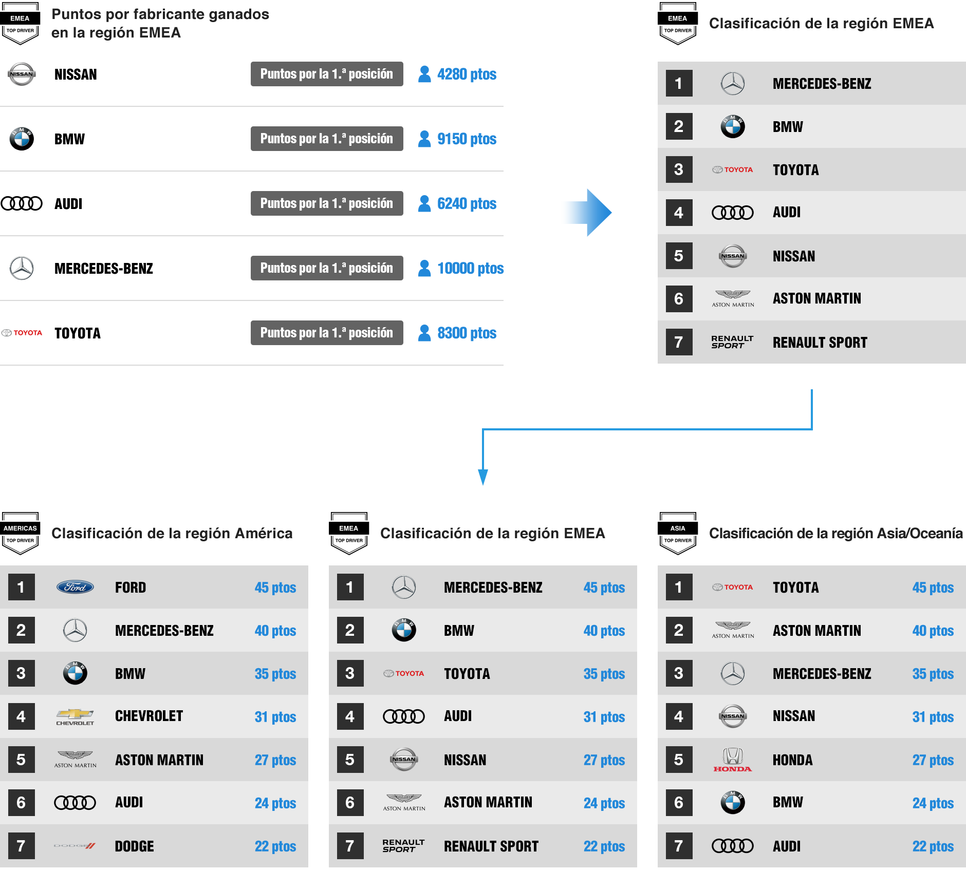 Se contarán los puntos concedidos a cada fabricante en las 3 regiones para confeccionar la clasificación global de fabricantes.