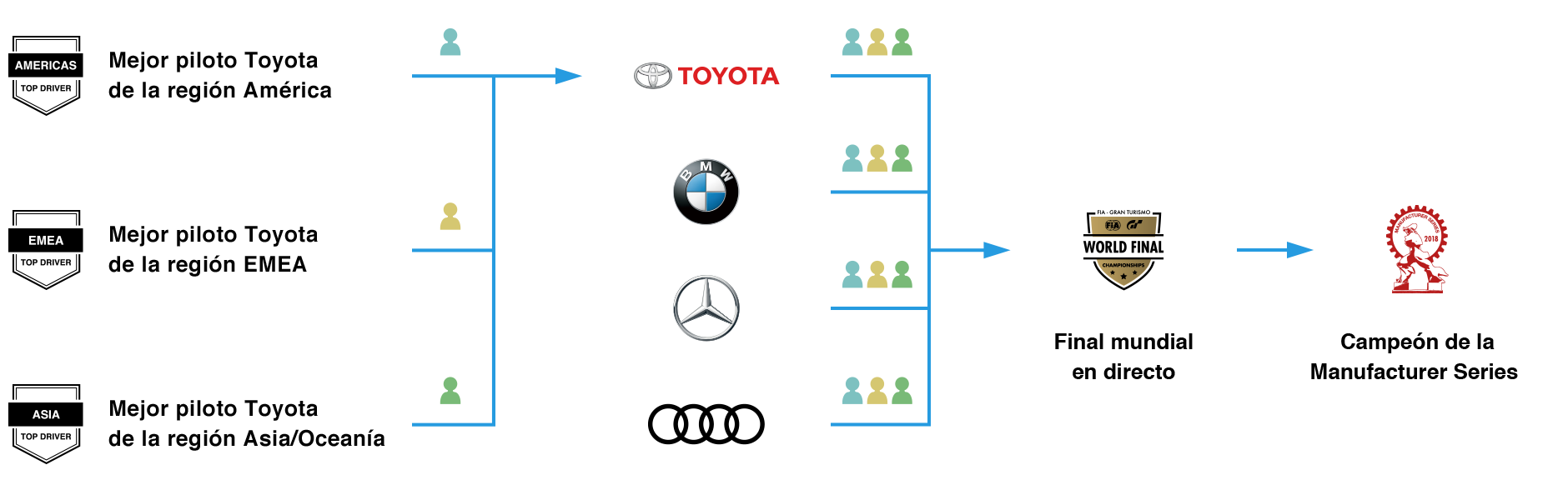 En la Manufacturer Series, los resultados de la Temporada final online generarán una clasificación global de fabricantes, en la que los 16 mejores fabricantes serán elegidos para pasar a la final mundial. Los mejores jugadores de cada región para cada uno de los 16 fabricantes pueden participar en el evento de la final mundial (3 jugadores de un total de 3 regiones).
