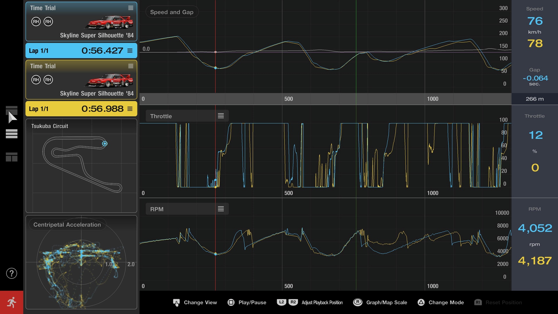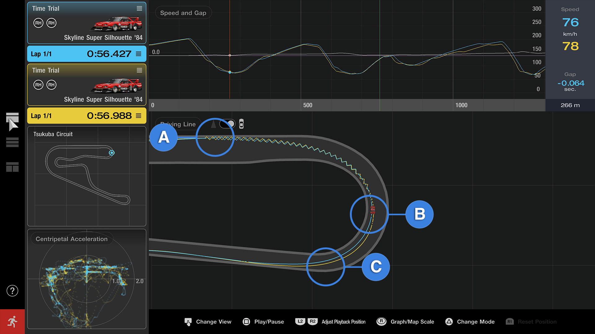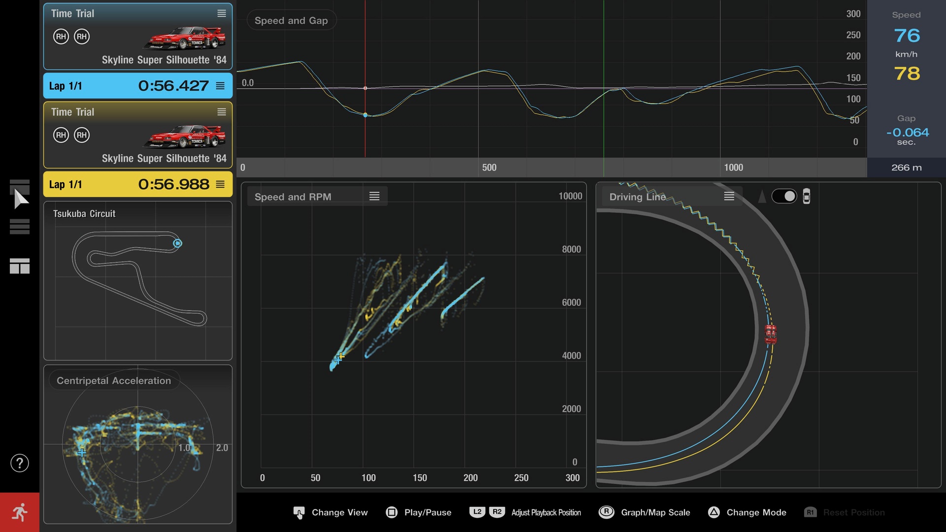 El Registrador de datos también viene genial para modificar los ajustes del coche. Vamos a cambiar de coche y a fijarnos en lo mismo, la curva 1 del Tsukuba.