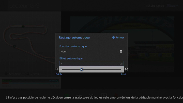 Si vous n'avez pas réussi à régler le décalage entre la trajectoire du jeu et celle empruntée lors de la véritable course avec la fonction "Régler trajectoire GPS", qui permet de déplacer horizontalement et verticalement cette trajectoire, activez la fonction automatique. Les roues de la voiture suivront alors automatiquement la surface du circuit, effaçant les problèmes éventuels.