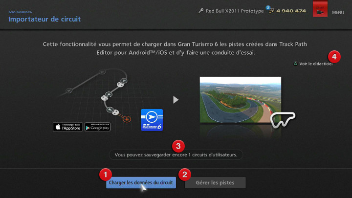- Le nombre restant de circuits d'utilisateurs que vous pourrez sauvegarder. Vous pouvez sauvegarder un maximum de 30 circuits d'utilisateurs dans GT6. Les circuits créés par vos amis de la Communauté comptent aussi dans ce total.