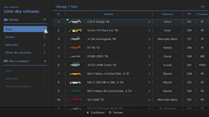 Votre Liste des voitures se répartit entre votre garage, où vous conservez les véhicules les plus utilisés, et le parc à voitures, où vous garez le reste de votre collection. Considérez la fréquence à laquelle vous conduisez une voiture lorsque vous voulez la stocker. Le garage peut accueillir 500 voitures et le parc à voitures a une capacité de 9 999 véhicules.