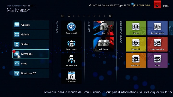 Pour utiliser la fonctionnalité de messagerie, veuillez vous connecter à PSN℠ avant de lancer Gran Turismo 6. Pour plus de détails sur cette fonctionnalité, consultez la page "Messages" dans la section "Communauté" de ce manuel.