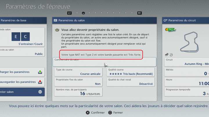 Gran Turismo 6 déterminera votre vitesse de connexion et votre type de NAT basé sur votre environnement réseau. Ils peuvent être vus tous les deux lors de la création d'un salon en mode Salon ouvert, en sélectionnant "Paramètres du salon".