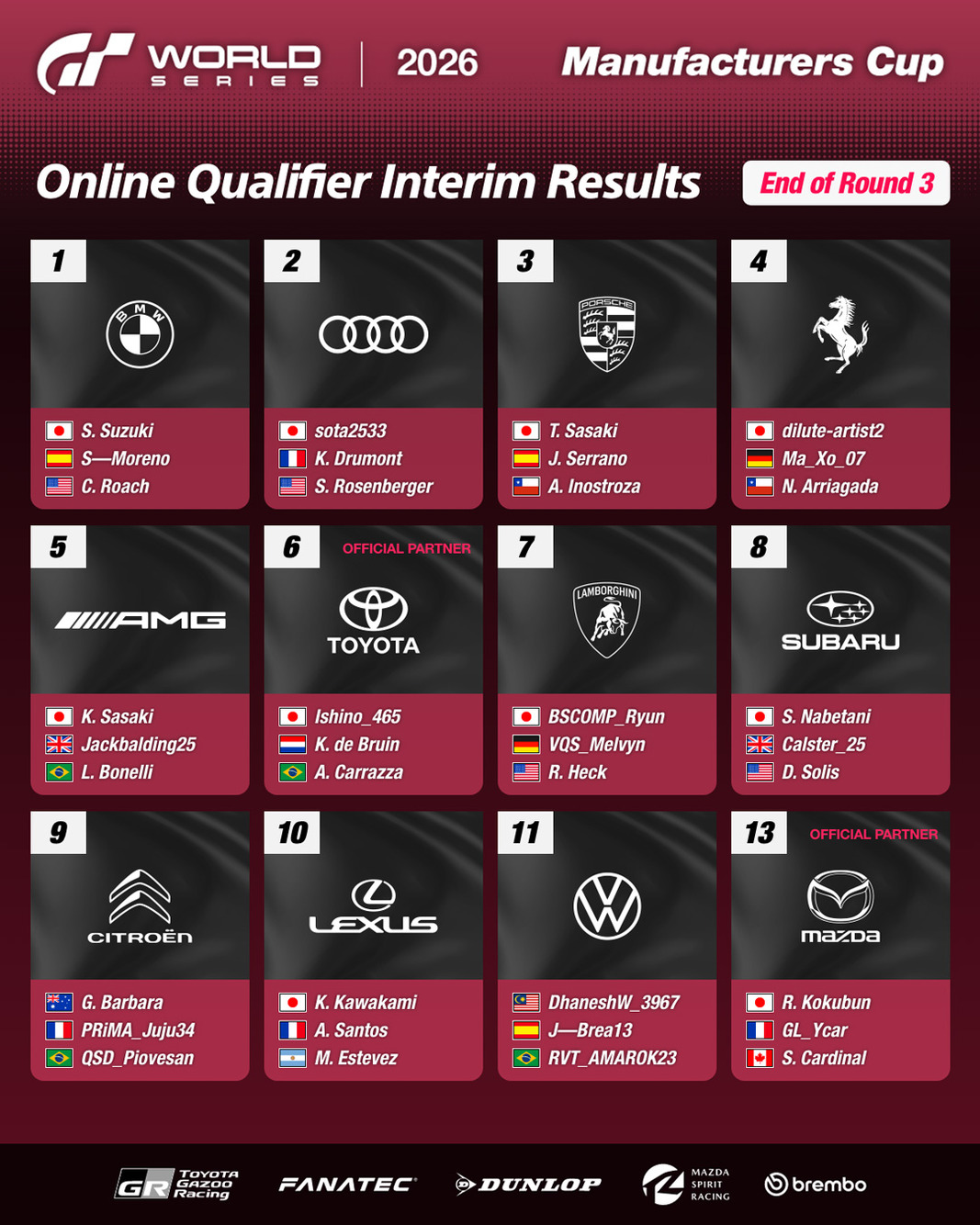 Liste provisoire des constructeurs des qualifications en ligne des Gran Turismo World Series 2026 - Manufacturers Cup (fin de la manche 3)