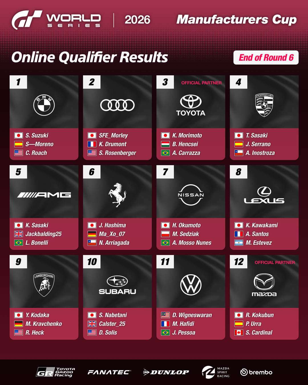 The final round of the 'Gran turismo World Series' 2026 Online Qualifiers - Manufacturers Cup was hosted on 31 January, deciding the 12 manufacturers that will compete in the 'World Series Rd.1-3' and 'World Finals' live events.