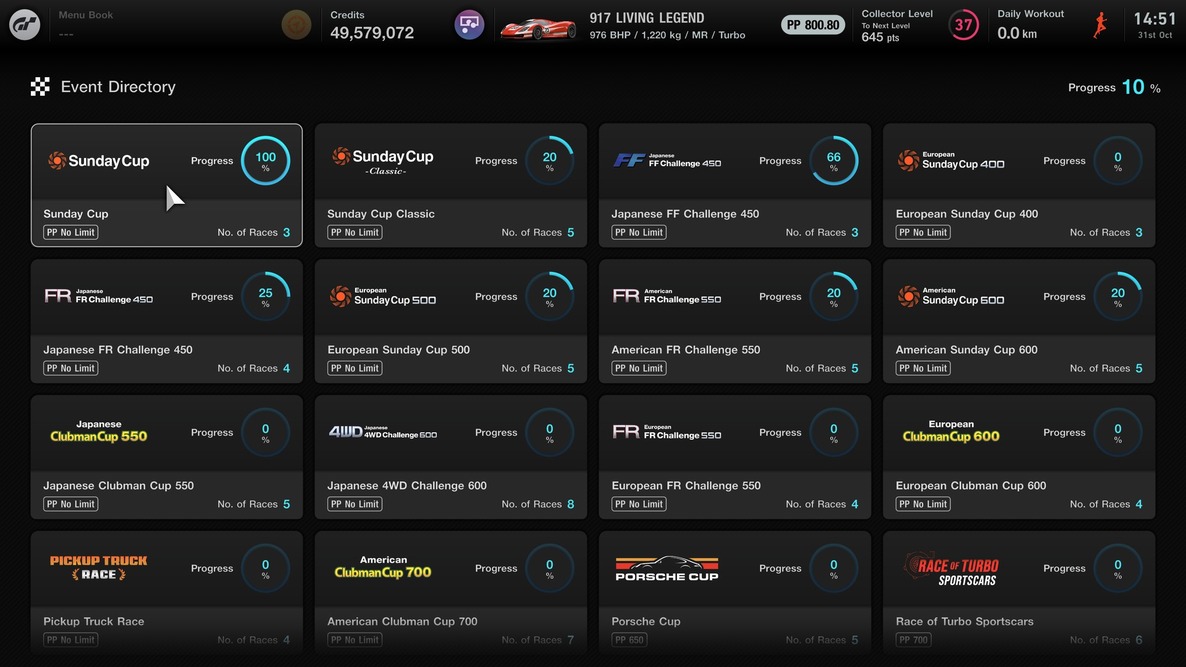 The new 'Event Directory' button added to the top-right of the screen makes it quick and easy to find all the race events currently available in World Circuits. Pressing the new button brings up a list of all races that the player can enter according to their game progress. Select a race from the directory to get straight into the action.