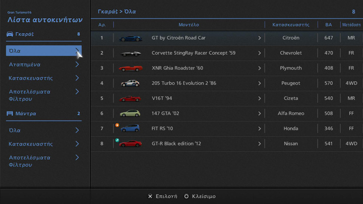 Μπορείτε να αλλάξετε τη σειρά με την οποία προβάλλονται τα αυτοκίνητα στο Γκαράζ και στη Μάντρα και να φιλτράρετε τα αυτοκίνητα που θα προβάλλονται. Αυτό μπορείτε να το κάνετε χρησιμοποιώντας τις επιλογές που βρίσκονται στην αριστερή άκρη της οθόνης Λίστας αυτοκινήτων.