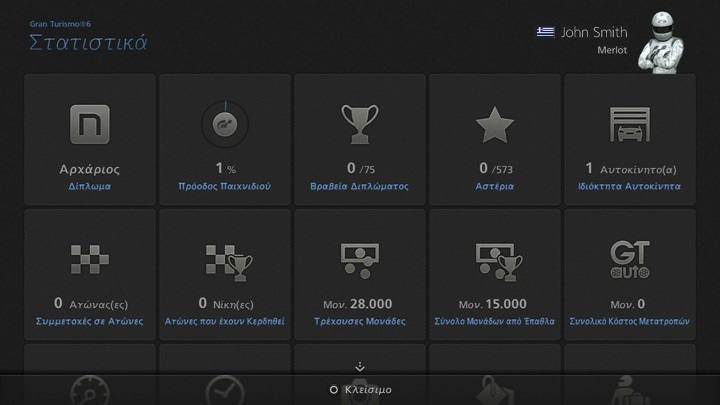 - Το σύνολο του χρόνου που έχετε περάσει στο τιμόνι μέχρι στιγμής. Προσμετρείται ο χρόνος οδήγησής σας στο Μάθημα, στο Γρήγορο Παιχνίδι, στον Ελεύθερο Αγώνα, στην Καριέρα (συμπεριλαμβάνονται οι αγώνες Προδιαγραφών Β), στο Ανοιχτό Σαλόνι και στη Γρήγορη Αναμέτρηση, καθώς και στις Διοργανώσεις Σεζόν, στις Ειδικές Διοργανώσεις, στα σαλόνια λέσχης και στις διοργανώσεις λέσχης, καθώς και ο χρόνος οδήγησης Αυτοκινήτων Εξυπηρέτησης και Δανεικών Αυτοκινήτων.