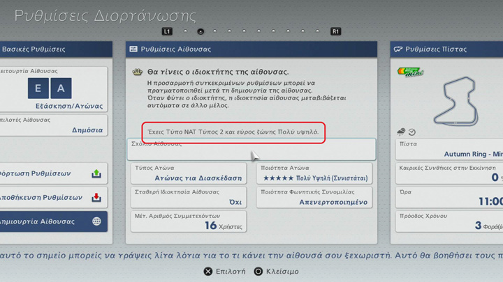 Το Gran Turismo 6 θα καθορίσει το εύρος ζώνης και τον τύπο NAT σας, βάσει του περιβάλλοντος δικτύου σας. Μπορείτε να δείτε το εύρος ζώνης και τον τύπο NAT που διαθέτετε, όταν δημιουργείτε μια αίθουσα στη λειτουργία Ανοιχτό Σαλόνι, επιλέγοντας «Ρυθμίσεις αίθουσας».
