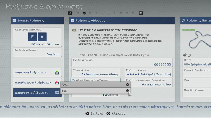 Στη λειτουργία Ανοιχτό Σαλόνι, ο παίκτης που δημιουργεί την αίθουσα γίνεται ιδιοκτήτης της. Προσαρμόζοντας τις ρυθμίσεις αίθουσας, μπορείτε να επιλέξετε εάν η ιδιοκτησία της αίθουσας θα είναι σταθερή. Το εάν πρέπει να επιλέξετε σταθερή ιδιοκτησία αίθουσας εξαρτάται από το εύρος ζώνης και τον τύπο NAT του ιδιοκτήτη. Για περισσότερες λεπτομέρειες, δείτε παρακάτω. Για περισσότερες λεπτομέρειες σχετικά με το εύρος ζώνης και τον τύπο NAT, ανατρέξτε στη σελίδα «Πώς να απολαμβάνετε ομαλή αγωνιστική εμπειρία στο διαδίκτυο».