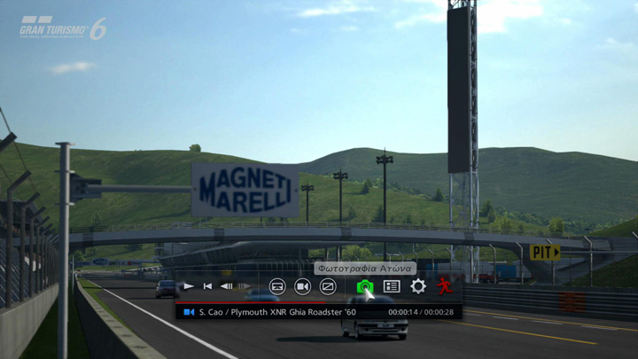 Πατώντας οποιοδήποτε κουμπί ή πλήκτρο στο χειριστήριο κατά την αναπαραγωγή μιας επανάληψης, θα εμφανιστεί η γραμμή εργαλείων. Μόλις εντοπίσετε ένα καλό στιγμιότυπο για φωτογράφηση, επιλέξτε «Φωτογραφία αγώνα» από τη γραμμή εργαλείων. Με αυτό τον τρόπο, η αναπαραγωγή θα σταματήσει προσωρινά και θα μεταβείτε στην Οθόνη επιλογής θέσης κάμερας. (Μπορείτε να πραγματοποιήσετε αυτή την ενέργεια σταματώντας προσωρινά την αναπαραγωγή μέσω της επιλογής «Παύση» ή πατώντας το Κουμπί START και επιλέγοντας στη συνέχεια «Φωτογραφία αγώνα».)