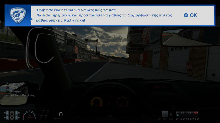 Εάν ξεκινάτε το παιχνίδι για πρώτη φορά, θα λάβετε ένα μήνυμα από την Gran Turismo Association, με το οποίο θα σας ζητά να πληκτρολογήσετε το όνομά σας. Αφού το κάνετε, μπορείτε να μάθετε τις βασικές αρχές της οδήγησης και πώς θα προχωρήσετε στο παιχνίδι με την καθοδήγηση της Association.
