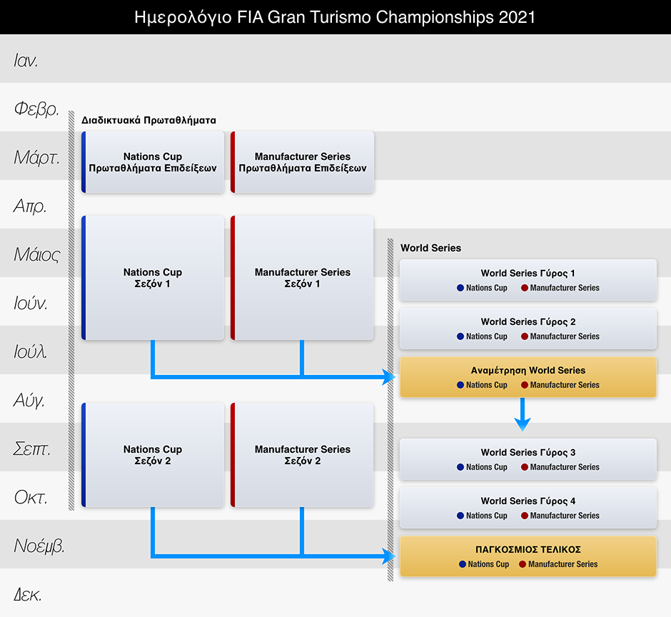 | Οδηγοί Αντιπροσώπευσης | Οι αντιπρόσωποι θα επιλεγούν από τους διαγωνιζόμενους που συμμετείχαν στους Παγκόσμιους Τελικούς του 2020 και επέλεξαν τον ίδιο κατασκευαστή για τη Σεζόν 1 των Διαδικτυακών Πρωταθλημάτων του 2021, ως εξής: 1. Από τους συμμετέχοντες στους Παγκόσμιους Τελικούς του 2020, βάσει της σειράς τους στην τελική κατάταξη. Εάν στην τελική κατάταξη υπήρξε ισοπαλία, η σειρά θα καθοριστεί από τα αποτελέσματα πρώτα στον Μεγάλο Τελικό, έπειτα στον Αγώνα 2 και τέλος, στον Αγώνα 1. 2. Αν δεν μπορεί να επιλεγεί διαγωνιζόμενος με τα προαναφερθέντα κριτήρια, η Polyphony Digital Inc. θα επιλέξει έναν διαγωνιζόμενο που συνεργάζεται με τον αντίστοιχο κατασκευαστή στη Σεζόν 1 των Διαδικτυακών Πρωταθλημάτων του 2021 και από τα αποτελέσματα των αγώνων του. |