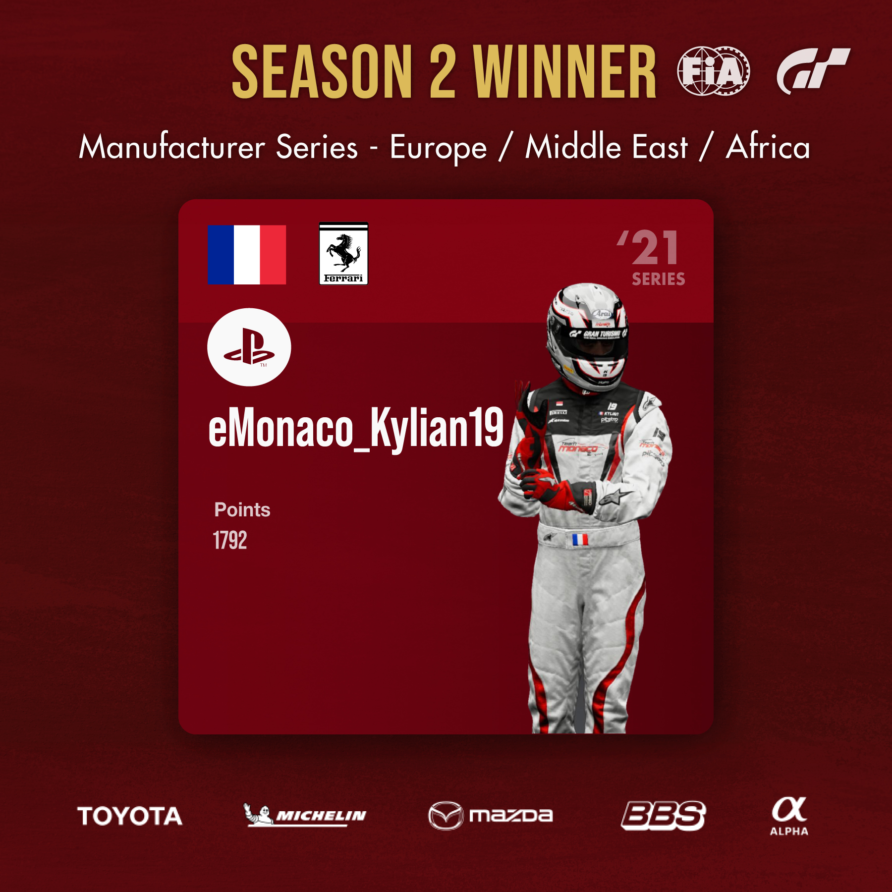 Η εκπληκτική επίδοση του eMONACO_Kylian19 στην αρχή της σεζόν ήταν με το παραπάνω αρκετή για να του φέρει τη νίκη, παρά τις μικρές δυσκολίες που συνάντησε προς το τέλος, χαρίζοντας επάξια τον τίτλο στη Ferrari!