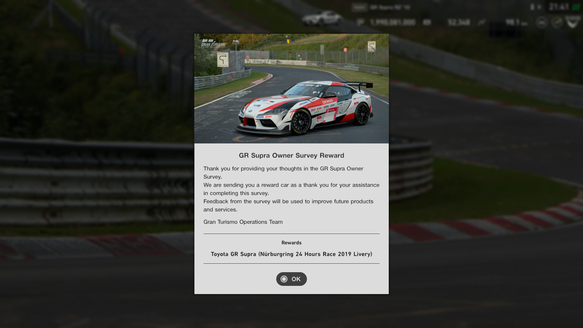 Σαν «ευχαριστώ» για τη συμπλήρωση αυτής της έρευνας, οι συμμετέχοντες θα λάβουν ένα μοναδικό αυτοκίνητο «GR Supra (Nürburgring 24 Hours Race 2019 Livery)» για να χρησιμοποιήσουν στο Gran Turismo Sport, το οποίο θα έχει την ίδια εμφάνιση με το αυτοκίνητο που συμμετείχε στον φετινό αγώνα 24 Ωρών της Nürburgring.