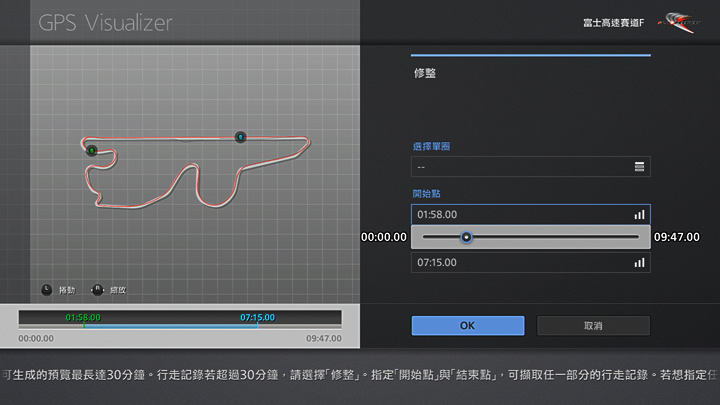 修整時可選擇單圈、或以時間來指定開始點與結束點兩種方法。若想指定特定單圈,請在[選擇單圈]選擇該單圈。若要從行走資料中擷取任意區段,請選擇[開始點]與[結束點]並按下確定,左右移動滑桿以指定時間。