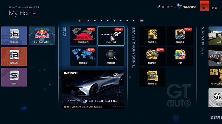 只要與"PSN"連線,『Gran Turismo 6』即會透過線上更新,不定期在「Vision Gran Turismo」公開新車。請在My Home的[Vision GT]索取已公開的車輛。選擇車輛並按下圖示,即會進入展示間畫面。展示間畫面除了可選擇車輛顏色之外,亦可觀賞相關影片與設計草圖。