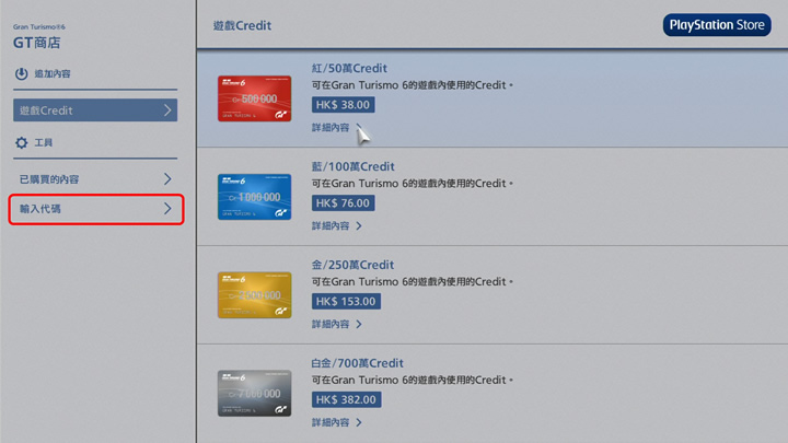 請在遊戲結束後,或在啟動遊戲前從PlayStation®3的XMB™進入PlayStation®Store,在畫面左方的[輸入代碼]輸入持有的產品代碼。下載完成後結束PlayStation®Store,啟動『Gran Turismo 6』, 車輛會追加至您的車庫中。同時[車庫]內的[賽車裝備]也會追加賽車服與頭盔、[上色]內會追加自訂上色組。此外Credit不會執行下載,但會配合上述操作追加Credit。
