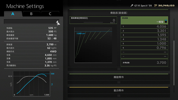 - 從畫面上方依序是「輪胎」「懸吊」「傳動系(變速器)」「傳動零件」「動力零件」「車身相關」等調校項目。各項目按下O 按鈕按鈕即會顯示各項零件。