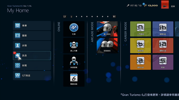 如要閱讀訊息,請登入PlayStation®Network之後,再啟動『Gran Turismo 6』。關於訊息的詳情,請參閱本說明書內「社群」的「訊息」。