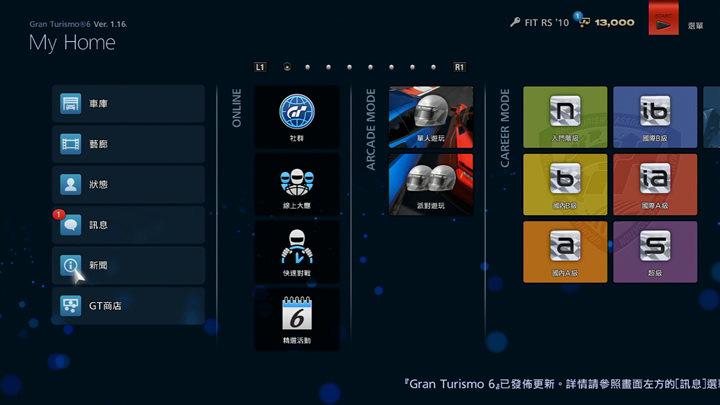 在新聞當中,會顯示來自『Gran Turismo 6』的更新資訊或通知。若有新的新聞,在My Home的「新聞」會顯示紅色的圓形數字。選擇My Home的「新聞」並按下確定時,也會進入社群內的「新聞」。
