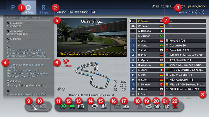 - 顯示房間狀況。淺藍色區塊是目前進行的競賽資訊。P代表練習中,Q代表正在進行預賽、R代表正在進行決賽、T代表正在進行計時爭奪賽、D代表正在進行甩尾爭奪賽、E代表正在進行耐久賽、F代表正在自由試跑。沒有預賽的房間會省略Q字。在Q、T、D下方會顯示限制時間(分鐘),R下方會顯示決賽的繞行圈數。