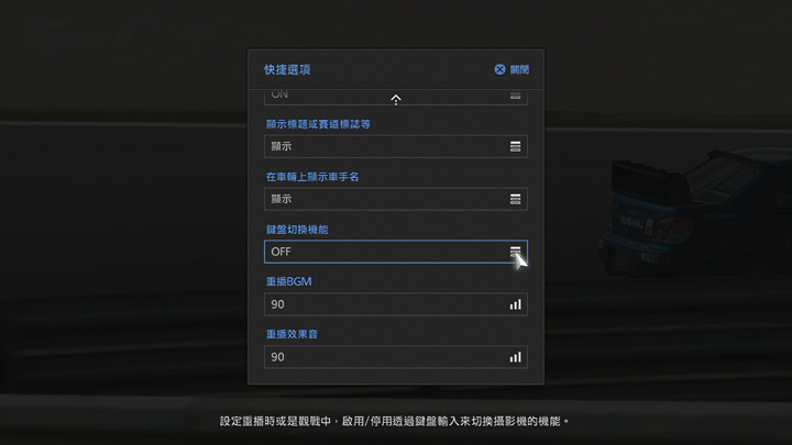 重播播放中,或在線上大廳的各房間內顯示觀戰中的工具列啟用「切換鍵盤機能」,即可使用USB鍵盤等顯示資訊或切換攝影機。若要使用本機能,請將USB鍵盤等裝置連接至PlayStation®3。