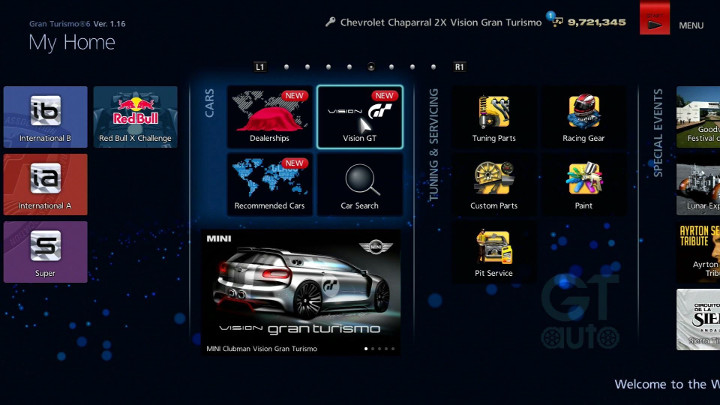 Connect to PlayStation®Network and the cars will gradually be unveiled via Gran Turismo 6 online updates. Select "Vision GT" from the "My Home" screen to claim these cars. Select a car and you will be taken to the Showroom Screen, where you can choose a colour for the car and view movies or sketches.
