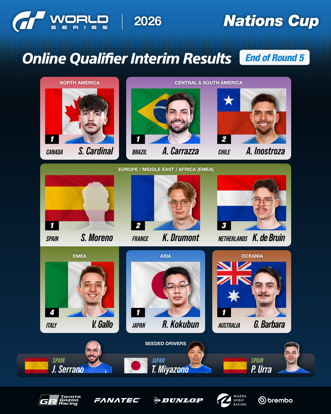 The "Gran Turismo World Series" 2026 Online Qualifiers – Nations Cup Provisional Results (End of Round 5)