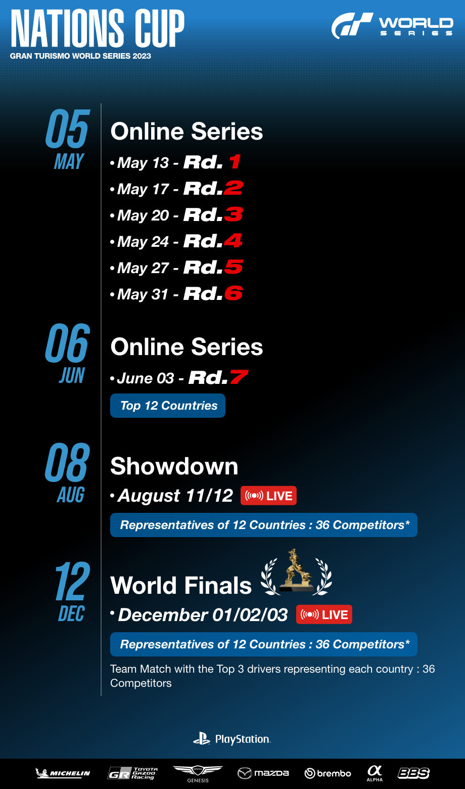 The winning team of the Nations Cup World Finals will become the 2023 Nations Cup Champion, and the World Finals winning team of the Manufacturers Cup will become the 2023 Manufacturers Cup Champion.