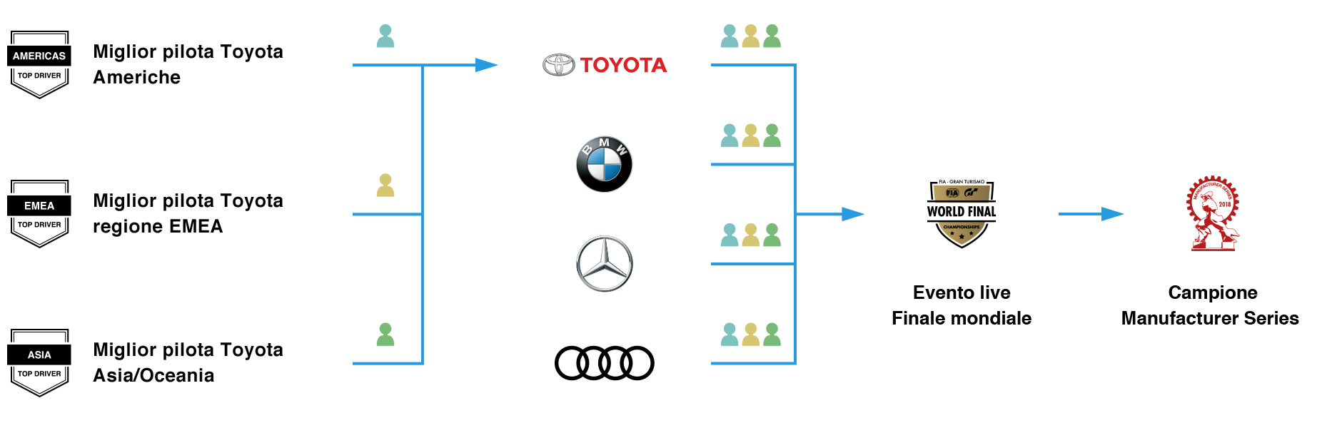 Nel Manufacturer Series, i risultati della stagione finale online produrranno una classifica globale dei costruttori, da cui verranno selezionati i primi 16 per la "Finale mondiale". I migliori giocatori di ciascuna regione per ognuno di questi 16 costruttori potranno partecipare all'evento "Finale mondiale" (3 giocatori di 3 regioni).