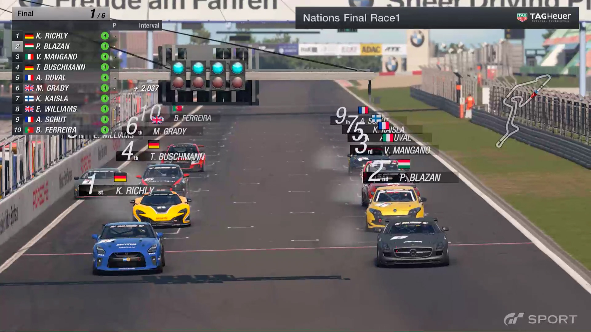 Race 1 was a 6 lap race in Gr.4 cars on the Nürburgring GP track. Richly in 2nd place on the grid (Nissan GT-R Gr.4) took off to a great start, followed by Blazan (Mercedes-Benz SLS AMG Gr. 4) who started on the pole. The others further behind on the grid were also keen to raise their position, with many close battles happening further down the line.