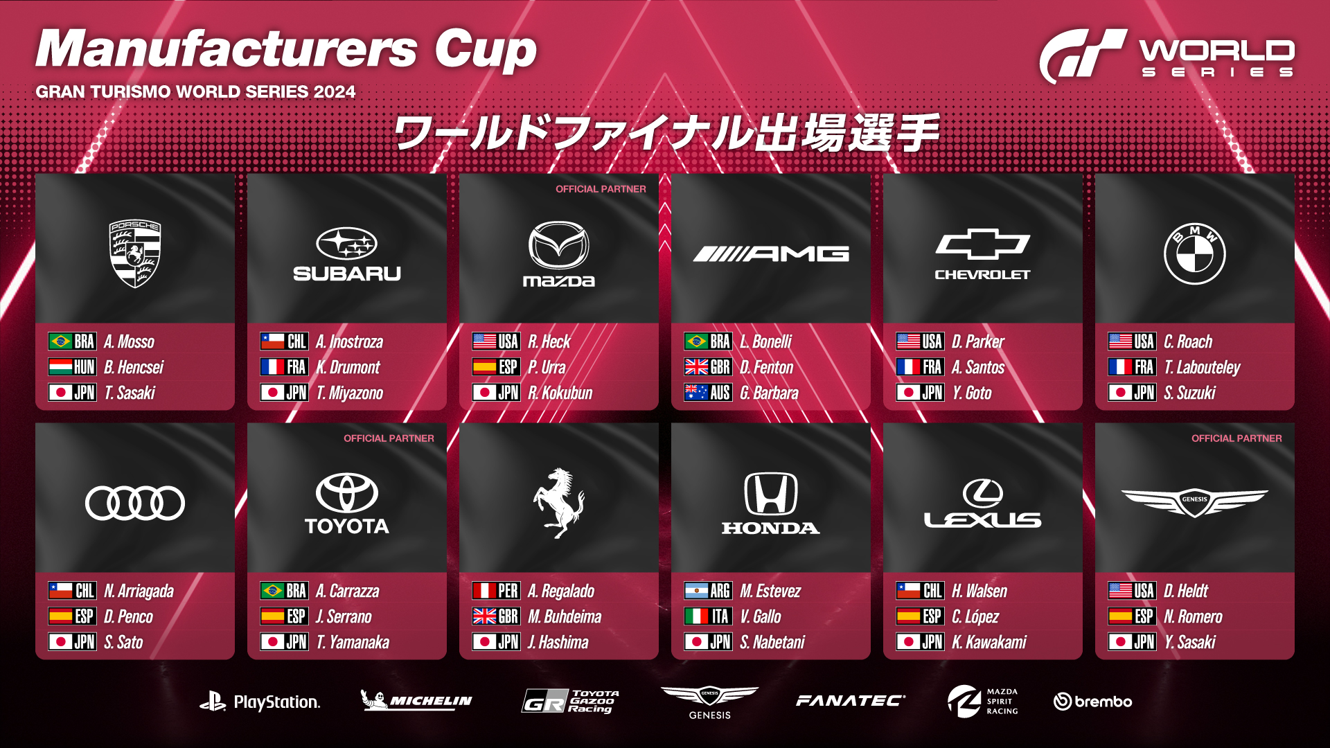 自動車メーカー対抗戦となるマニュファクチャラーズカップでは、グランツーリスモに登場するさまざまなクルマを目にすることができます。トヨタ、ジェネシス、マツダという3つのオフィシャルパートナーに加え、オンライン予選を上位成績で通過した9マニュファクチャラーを加えた合計12チームが参戦します。モントリオール、プラハ、東京の3ラウンドでは各チームから1名の選手が参加しましたが、ワールドファイナルでは3名のドライバーでチームを組み、12チームによる団体戦が繰り広げられます。