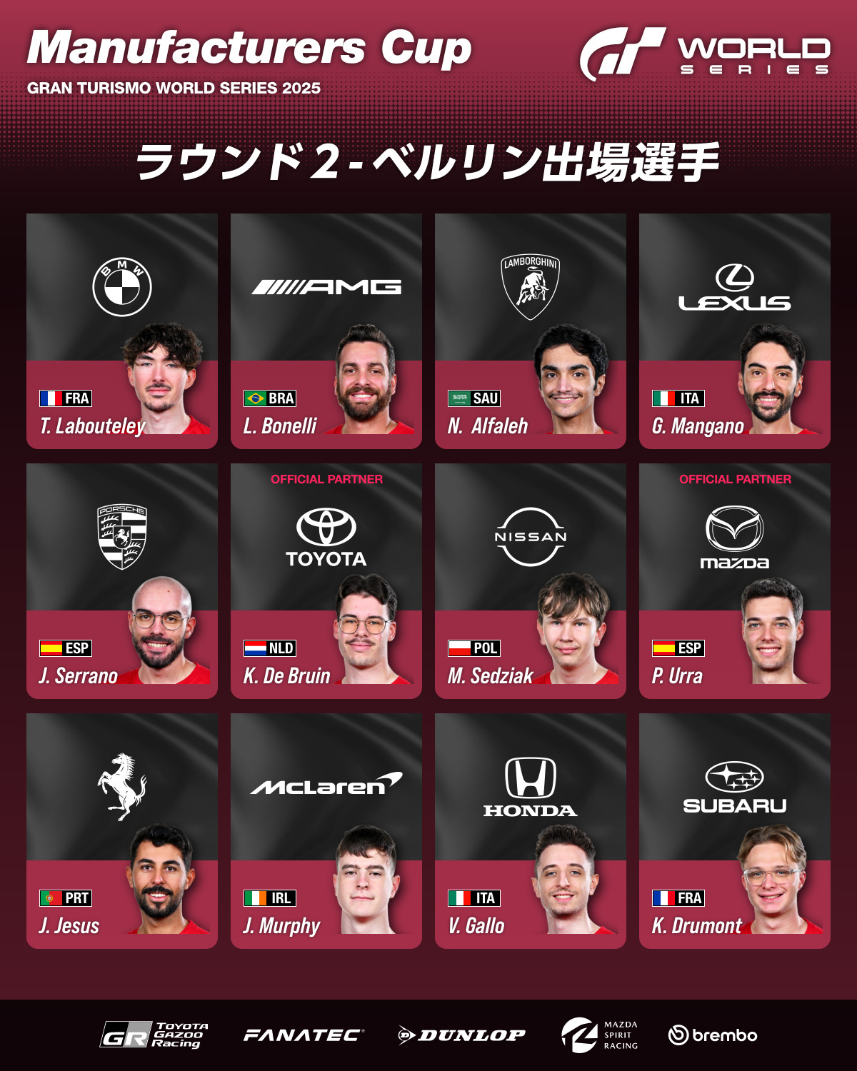 オフィシャルパートナーのトヨタ、マツダにオンライン予選のランキング上位を加えた合計12の自動車メーカー(マニュファクチャラー)が戦うチャンピオンシップです。各マニュファクチャラーの代表選手は欧州/中東/アフリカ地区、北米/中南米地区、アジア/オセアニア地区それぞれのオンライン予選でトップを獲得した3名。「ラウンド2 - ベルリン」には欧州 / 中東 / アフリカ地区の選手が出場します。