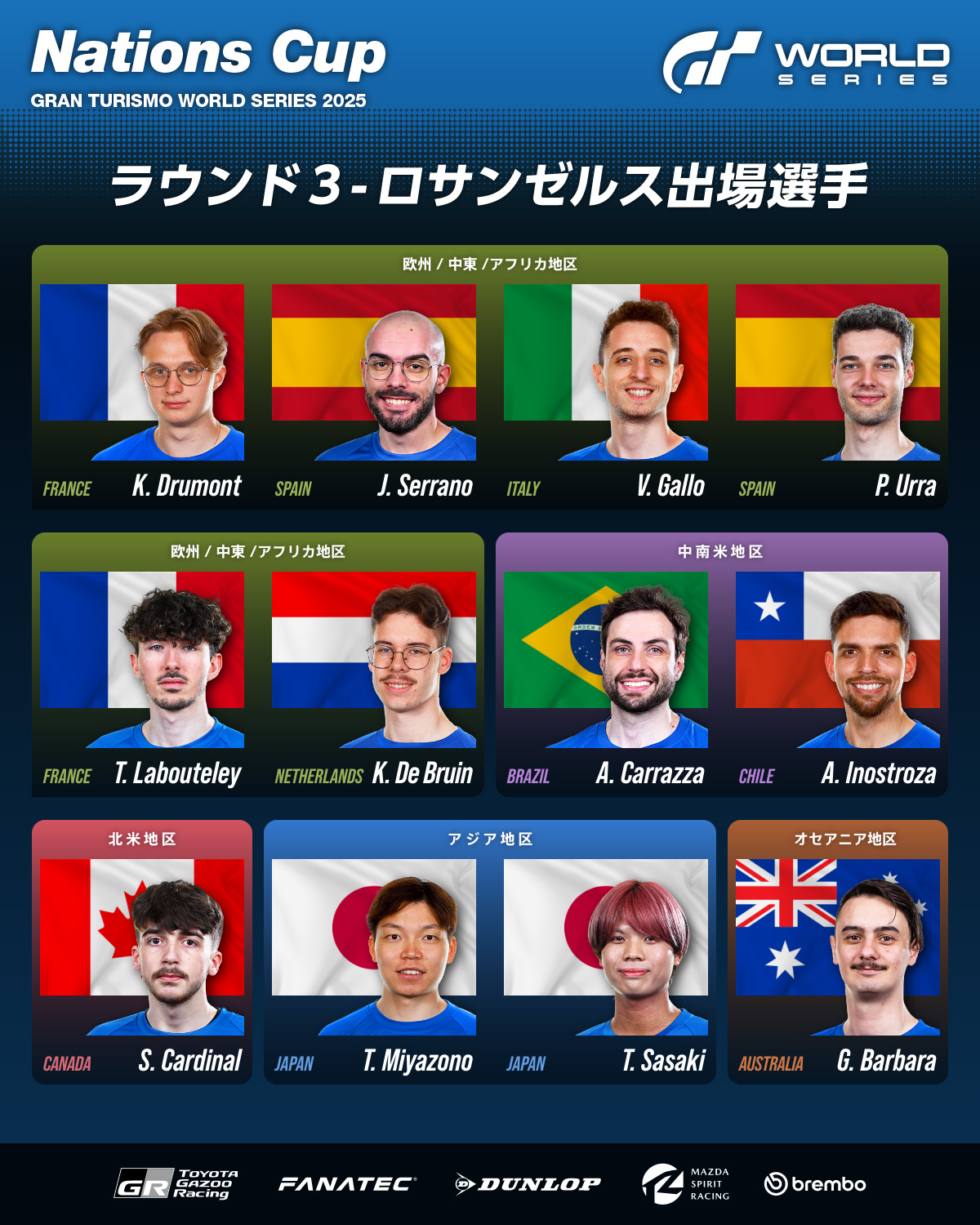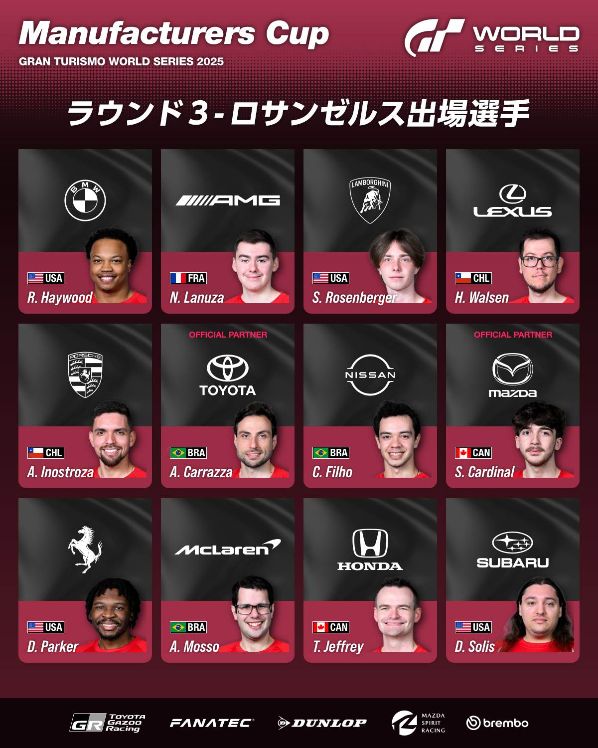 オフィシャルパートナーのトヨタ、マツダにオンライン予選のランキング上位を加えた合計12の自動車メーカー(マニュファクチャラー)が戦うチャンピオンシップです。各マニュファクチャラーの代表選手は欧州/中東/アフリカ地区、北米/中南米地区、アジア/オセアニア地区それぞれのオンライン予選でトップを獲得した3名。「ラウンド3 - ロサンゼルス」には北米/中南米地区の選手が出場します。