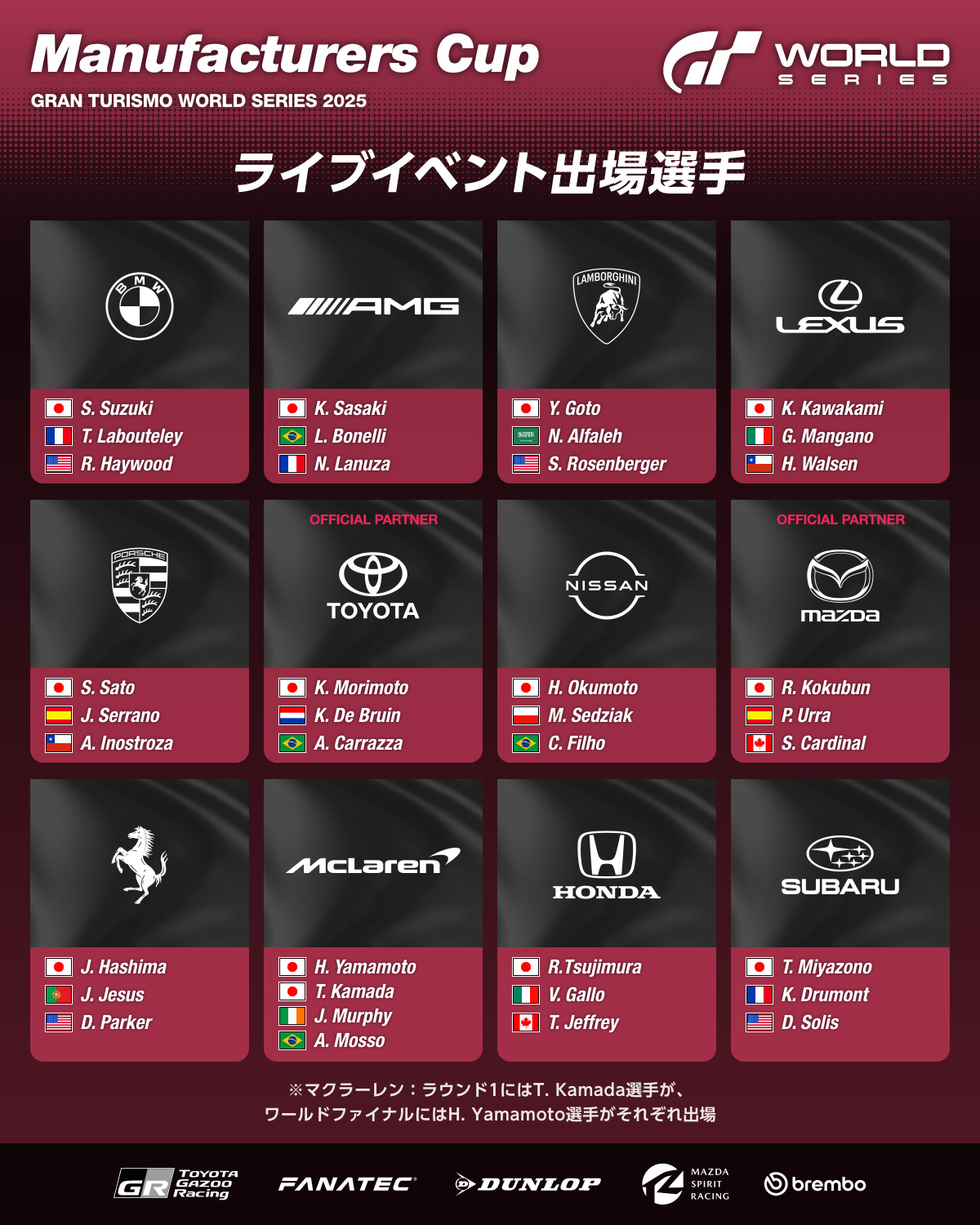 オフィシャルパートナーのトヨタ、マツダにオンライン予選のランキング上位を加えた合計12の自動車メーカー(マニュファクチャラー)が戦うチャンピオンシップです。各マニュファクチャラーの代表として戦うのは欧州/中東/アフリカ地区、北米/中南米地区、アジア/オセアニア地区それぞれのオンライン予選でトップを獲得した3名。ワールドファイナルには12チーム36名の選手が参加して団体戦を繰り広げます。
