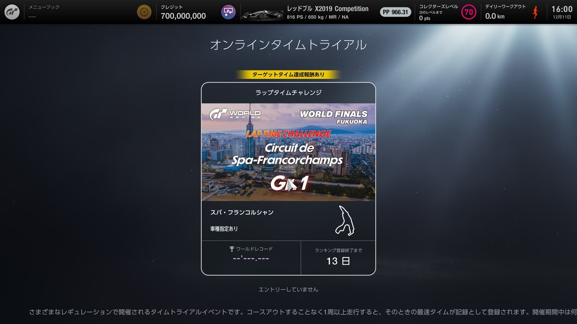 続く12月11日(木)に、ネイションズカップのレース1での使用コースとクルマの組み合わせによる「オンラインタイムトライアル」がスタート。このイベントでは、ターゲットタイム「銅」の基準を拡大し、獲得クレジットも2倍にアップしています。