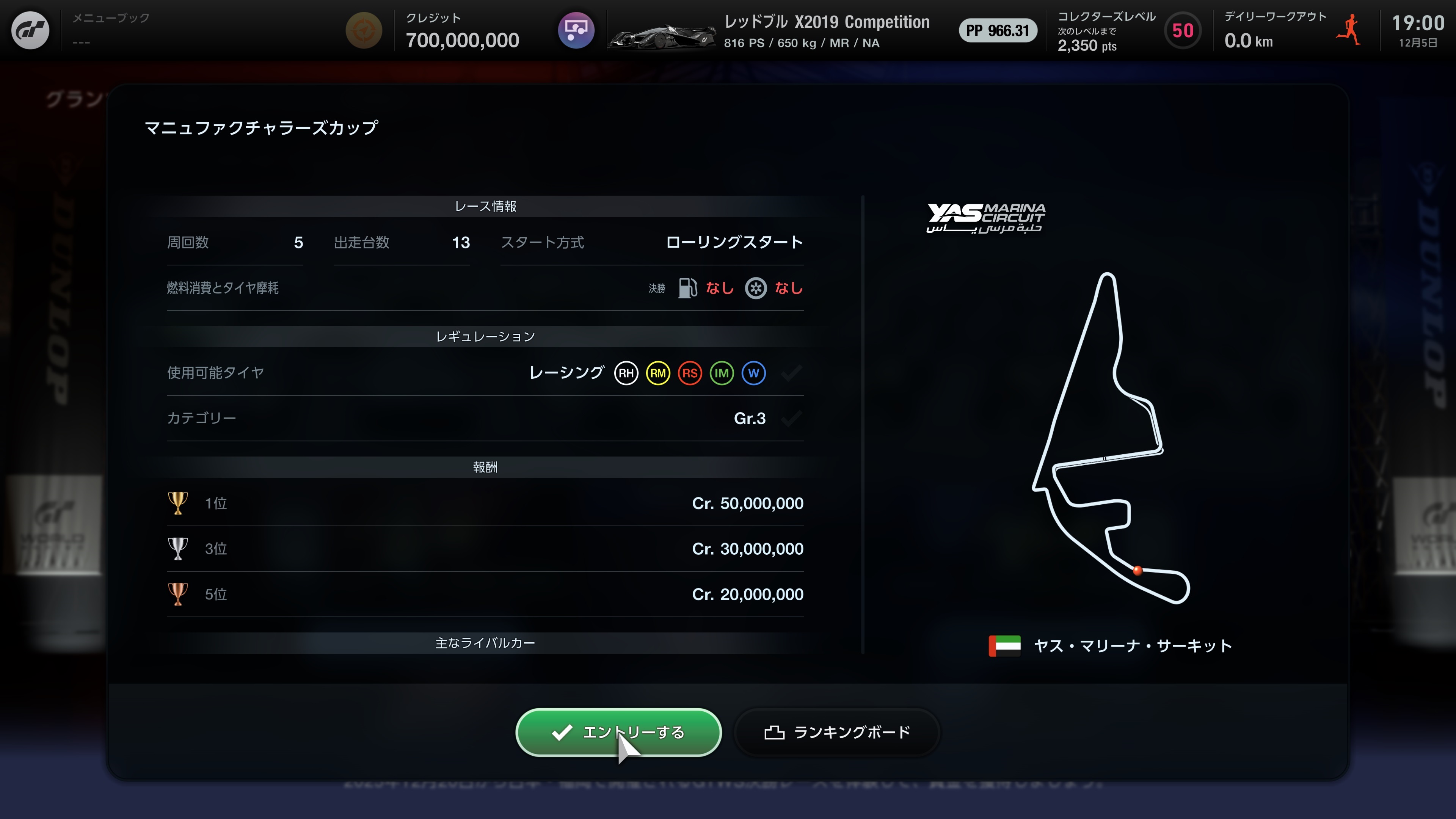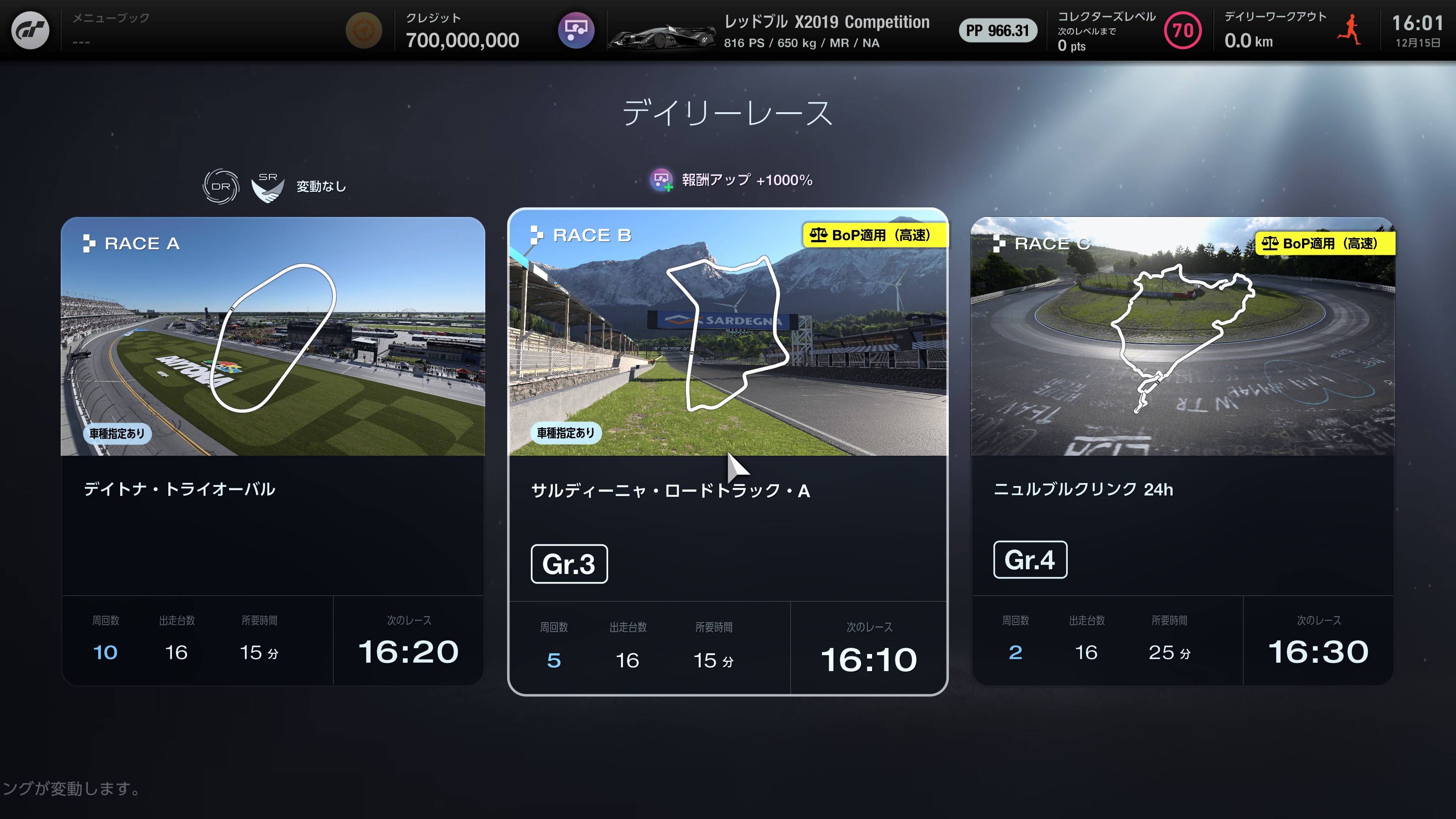 12月15日(月)には、マニュファクチャラーズカップのレース3をイメージしたレースを「デイリーレースB」でスタート。こちらも通常開催のイベントより、レース終了後に獲得できるクレジット額を大幅に増額しています。