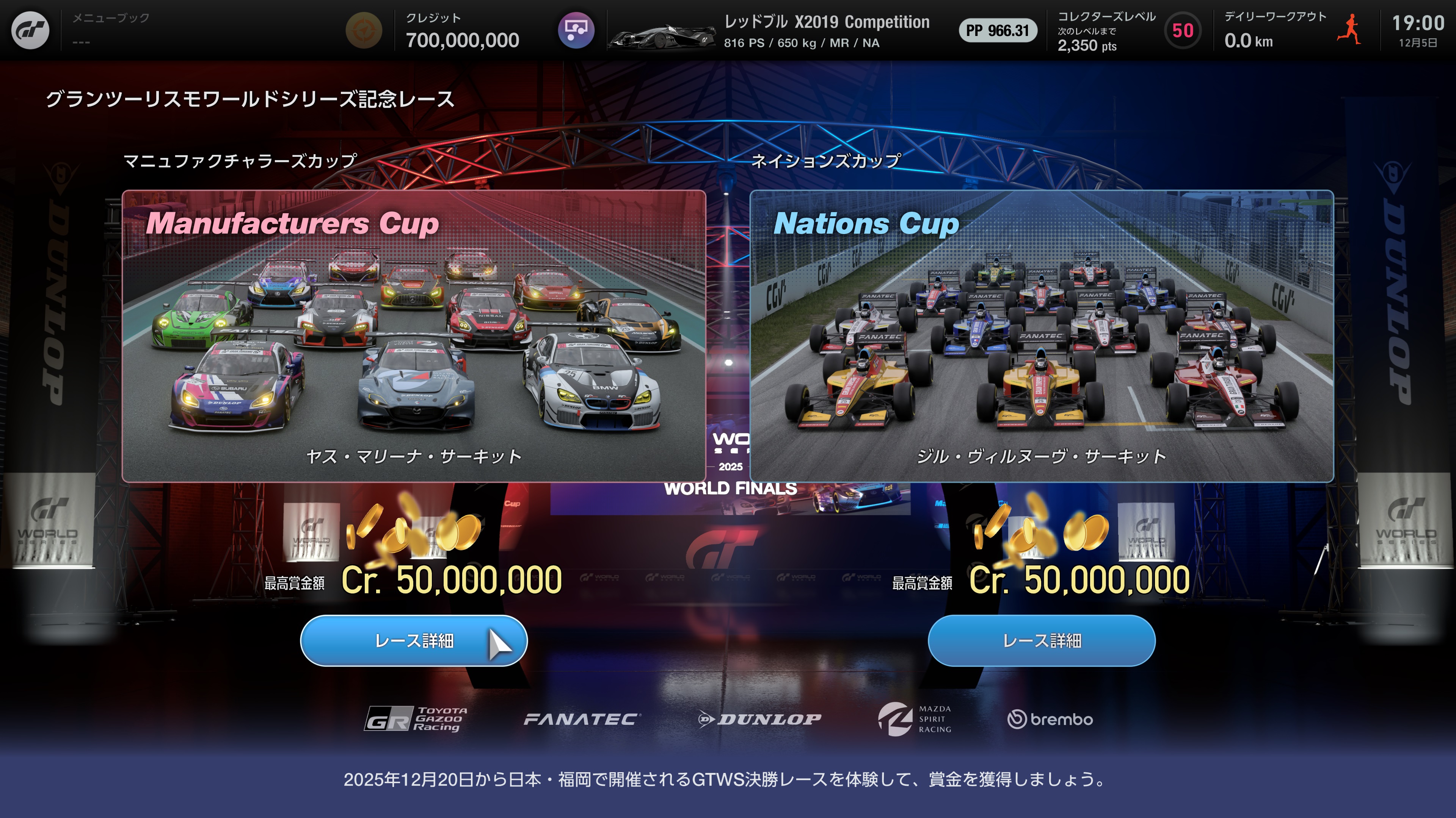12月20日(土)、21(日)に日本・福岡(福岡国際会議場)で開催される「グランツーリスモワールドシリーズ2025 ワールドファイナル 福岡」に連動する期間限定イベントを『グランツーリスモ7』内で開催します。現地で実施されるネイションズカップやマニュファクチャラーズカップの雰囲気を楽しめる4つのイベントを用意しました。