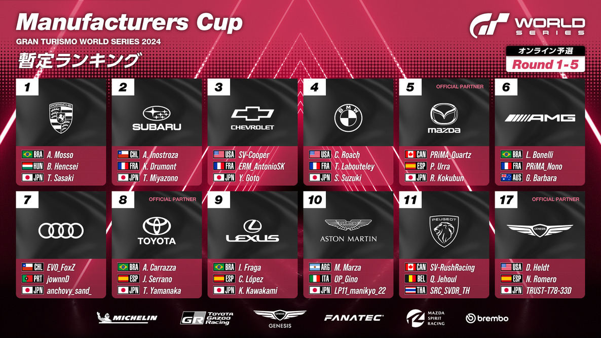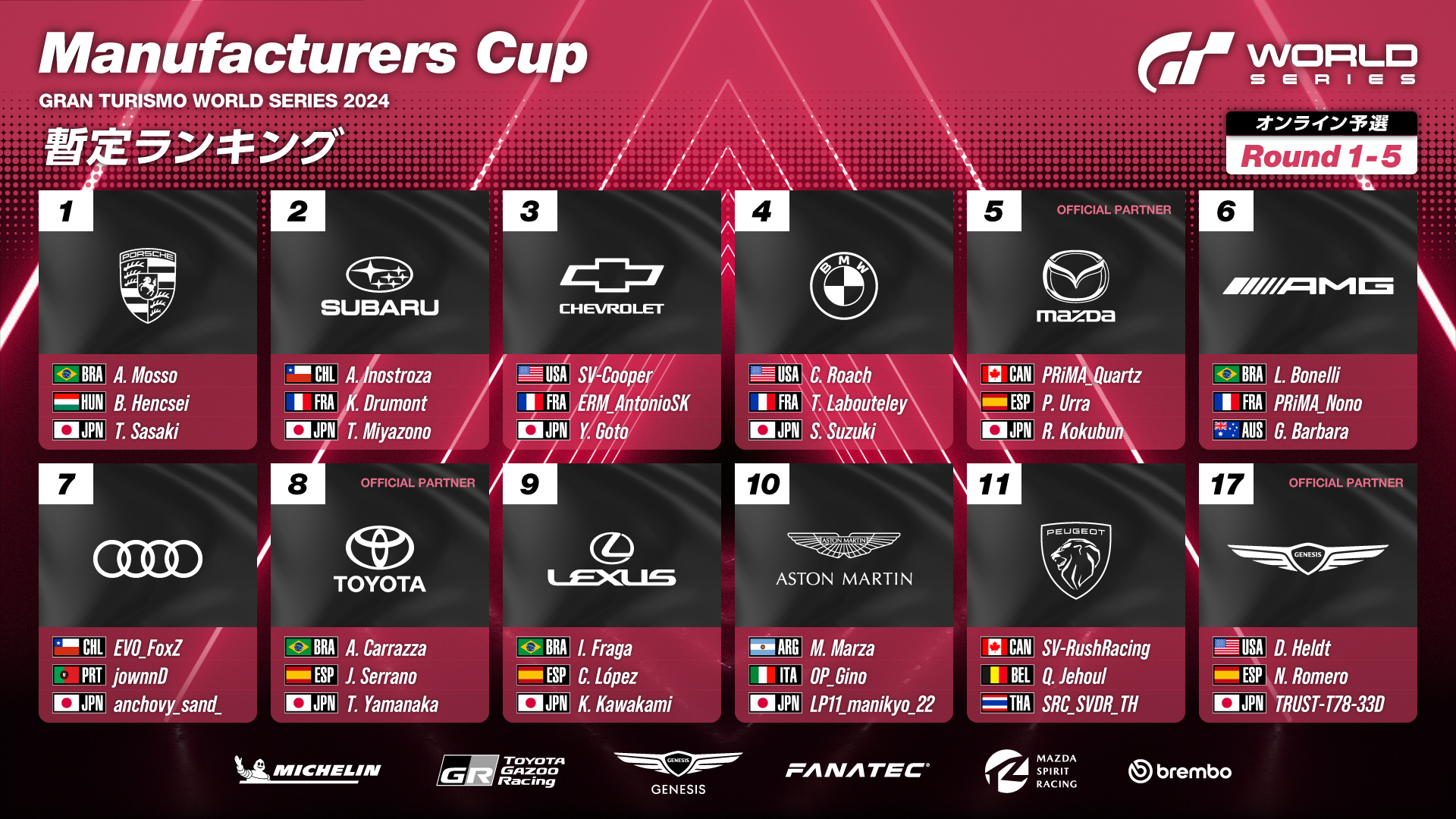 5月23日(木)、「グランツーリスモ ワールドシリーズ 2024 オンライン予選 - マニュファクチャラーズカップ」ラウンド5終了時点の途中経過を発表しました。